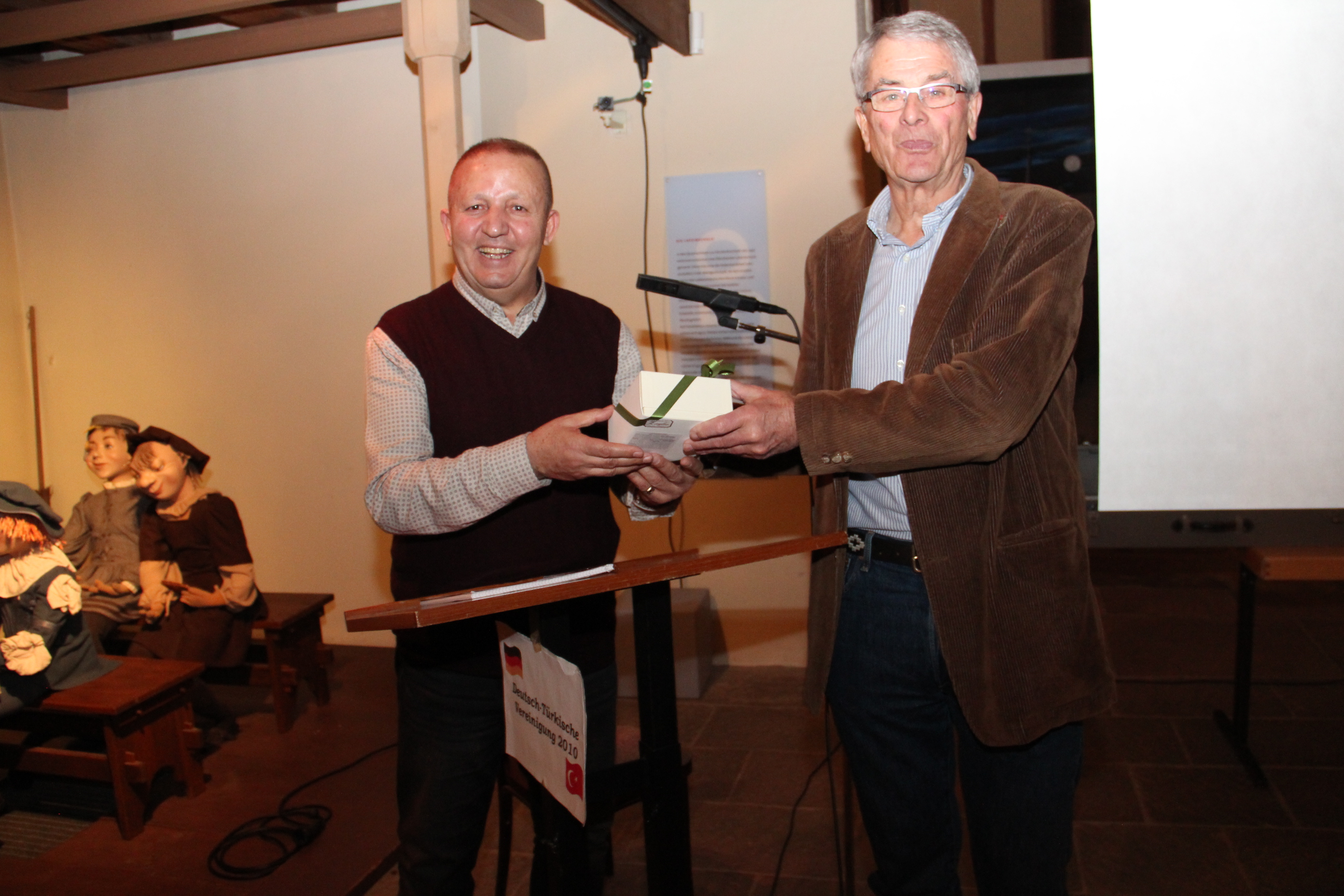 Metin Gökşen (links) erhält von Udo Kaupisch eine "süße" Aufmerksamkeit (Bild von Muzaffer Cetin)